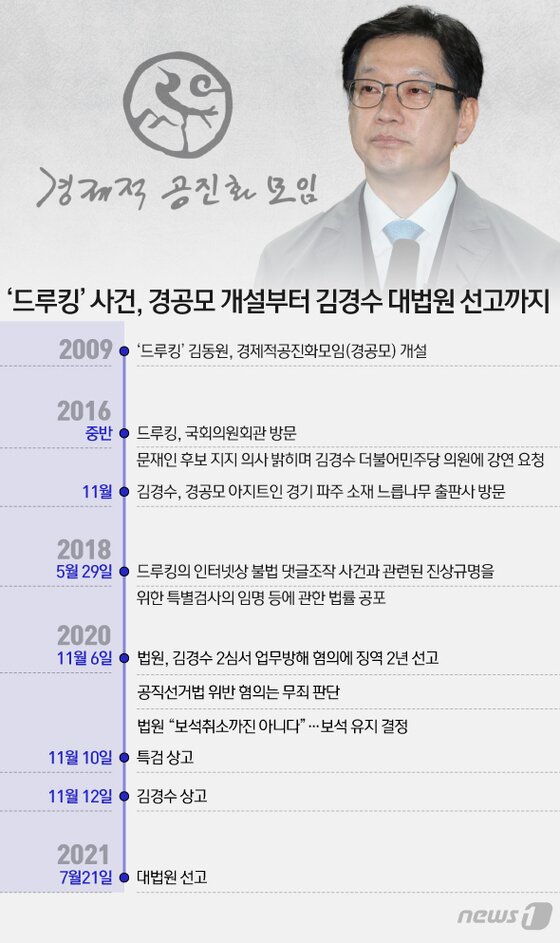 ì¬ì¸µë¶ì ë"루í¹ì å¼ íëë¼ì ìì ê°ë´ë² ë"ë£¨í¹ ê¹ê²½ì 커ë¥ì ë´ì¸ í'리ë ì ì¹ì¼ë° ì ì¹ ê¸°ì¬ë³¸ë¬¸ ì¤íì ê²½ì from cdn.speconomy.com '드루킹' 댓글 조작 공모 혐의로 1심에서 징역 2년을 선고받은 김경수 경남도지사가 30일 오후 서울중앙지방법원에서 호송차로 향하고 있다. 댓글을 이용한 불법 여론조작에 가담한 혐의로 기소된 김경수 경남도지사가 대법원에서 유죄가 확정됐다. 드루킹 댓글조작에 공모한 혐의로 김경수 경남지사가 21일 대법원에서 '징역2년'유죄선고를 받았습니다. (서울=뉴스1) = 2009년 '드루킹' 김동원, 경제적공진화모임(경공모) 개설 2016년 중반 드루킹, 국회의원회관 방문. 2017년 3월 중앙선거관리위원회가 검찰에 수사의뢰를 하면서 관련 의혹이 처음 제기된 지 4년4개월 만이다. 드루킹이란 사람과 연관은 악의적인 명예 훼손이라고 반박. 대법원 2부(주심 이동원 대법관)는 21일 컴퓨터 등 장애 업무방해, 공직선거법. 문재인 후보 지지 의사 밝히며 김경수.